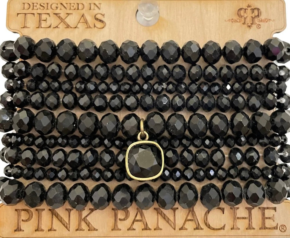 This bracelet has nine strands of black faceted beads. It features a 10mm jet Austrian crystal drop in a setting custom made for Pink Panache.