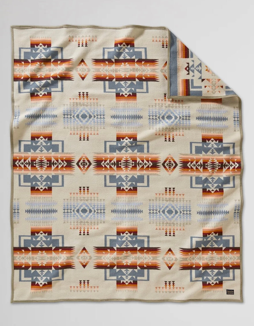 First woven in the 1920s, this USA-made wool blanket has been one of our most popular designs ever since. Chief Joseph led the Nez Perce tribe native to northeastern Oregon in the late 1800s. Widely admired for protecting his people and speaking the truth, he is honored with this design, symbolizing bravery. Bold arrowheads represent the chief's courage, strength and integrity. Reverses for two different looks.