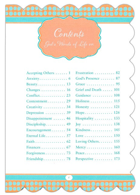 This beautiful and compact reference is exactly what you need for chaotic days or calm days. Whether you are looking for wisdom, help with anxiety, or are filled with praise to the Lord, you'll find Scripture promises and help divided by topic straight from God's Word. And you will find encouragement and insights from godly women including Joni Eareckson Tada, Ruth Bell Graham, Emilie Barnes, Rosa Parks, Elisabeth Elliot, Ann Kiemel Anderson, Marjorie Holmes, and others. The cover of God's Words of Life is designed by Award-winning designer Amy Butler.
