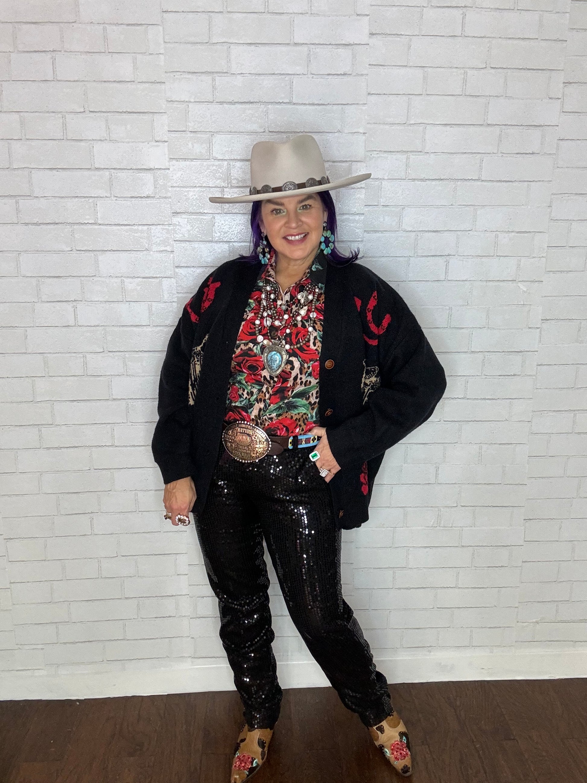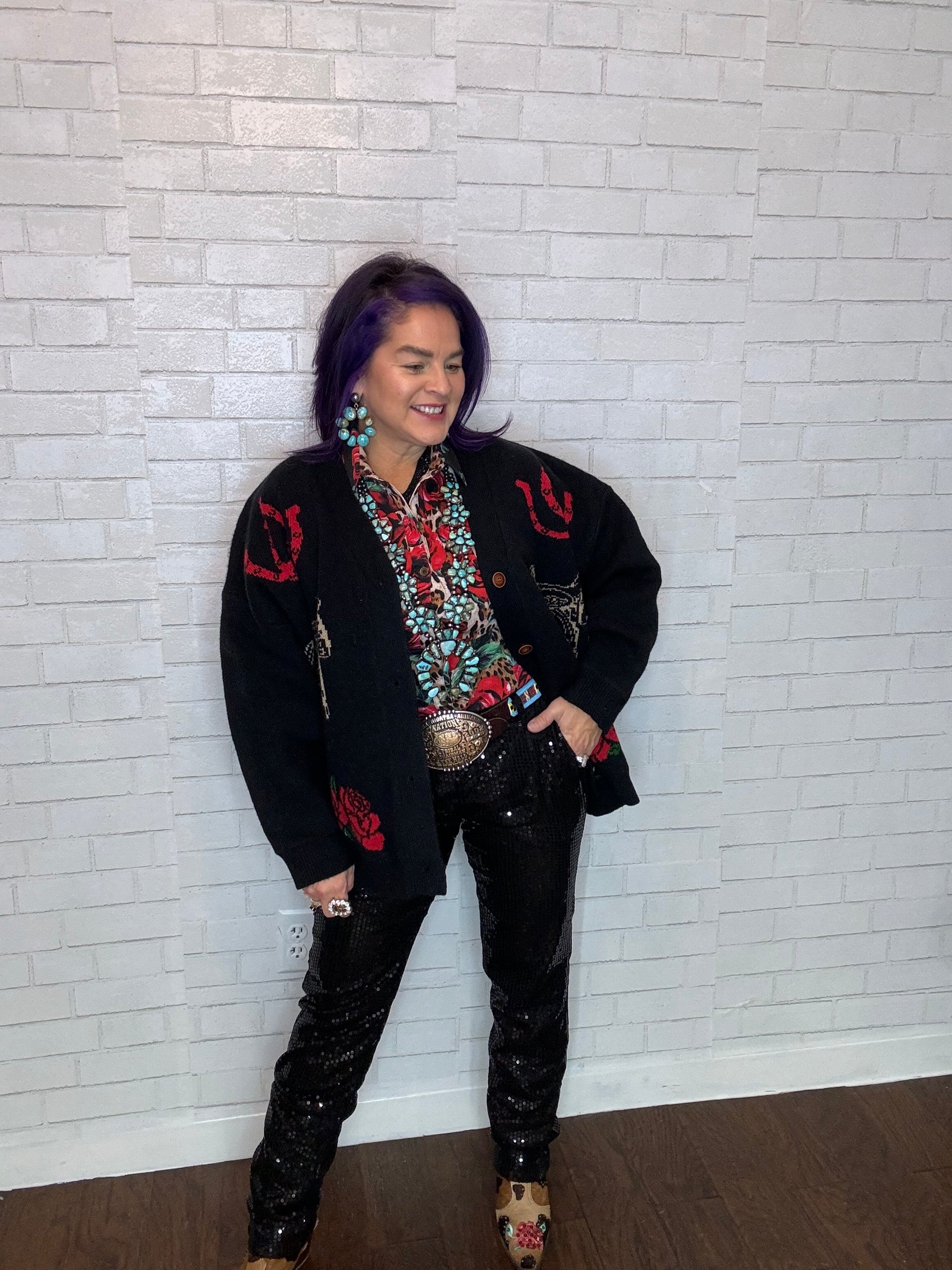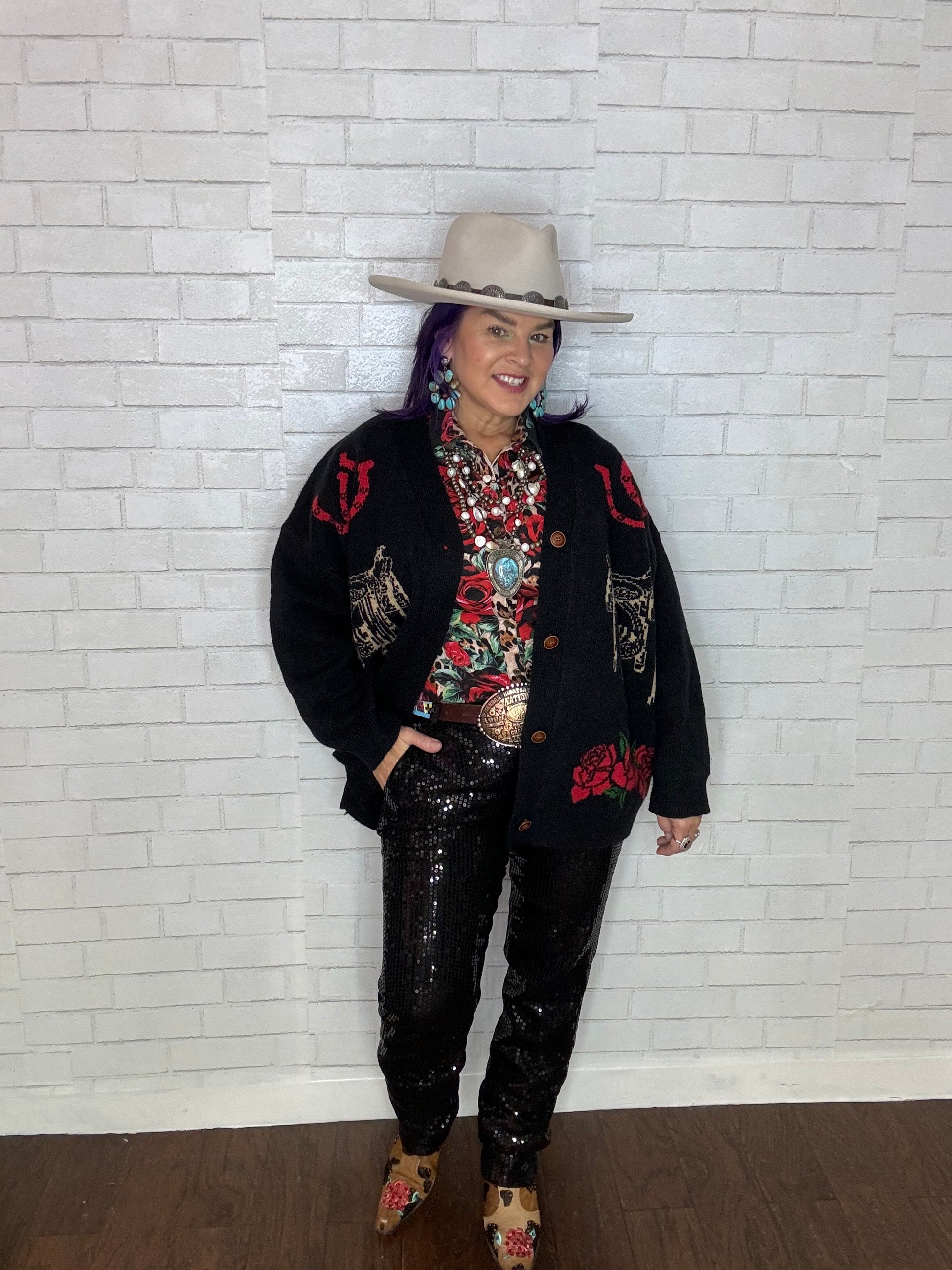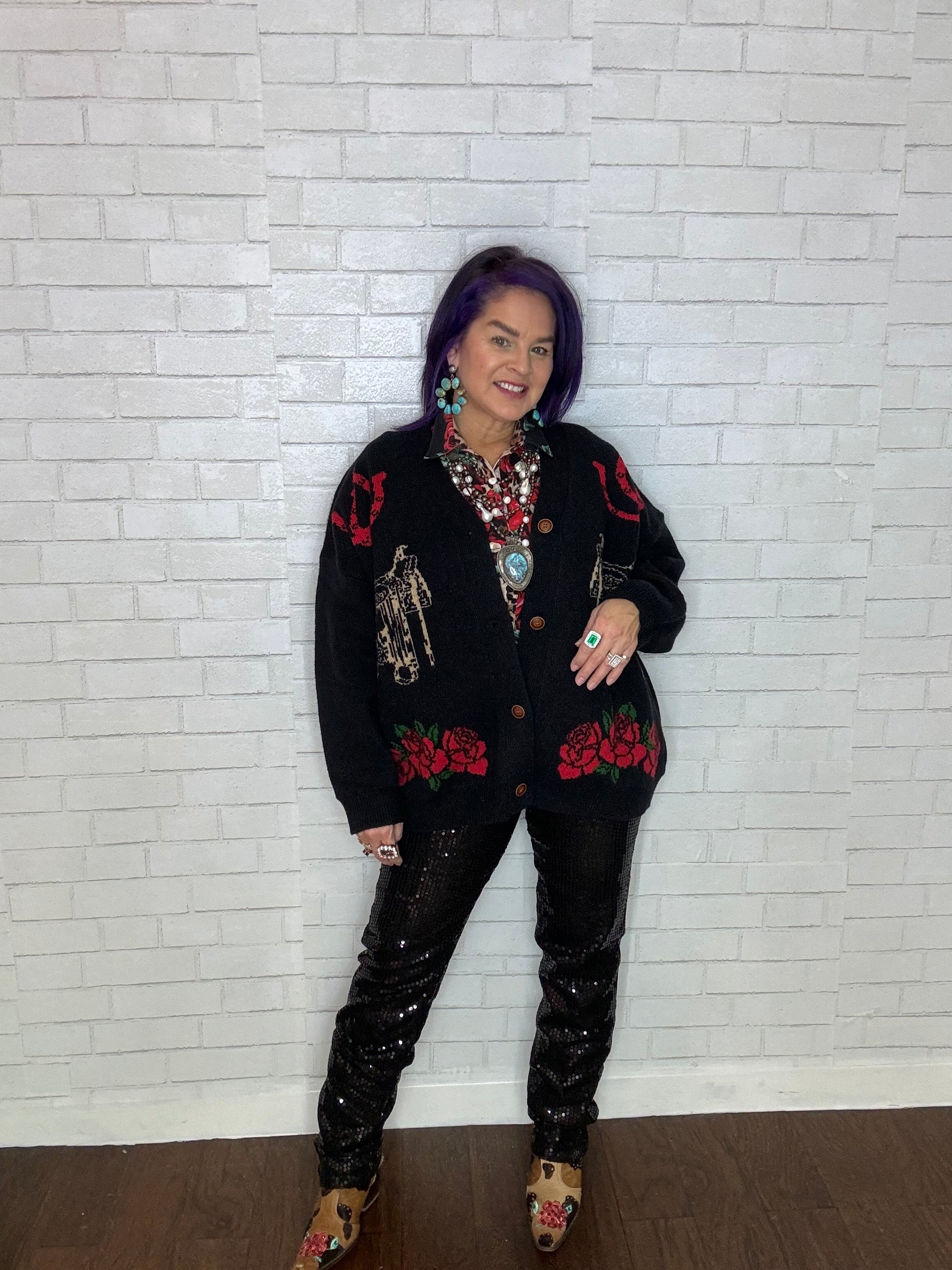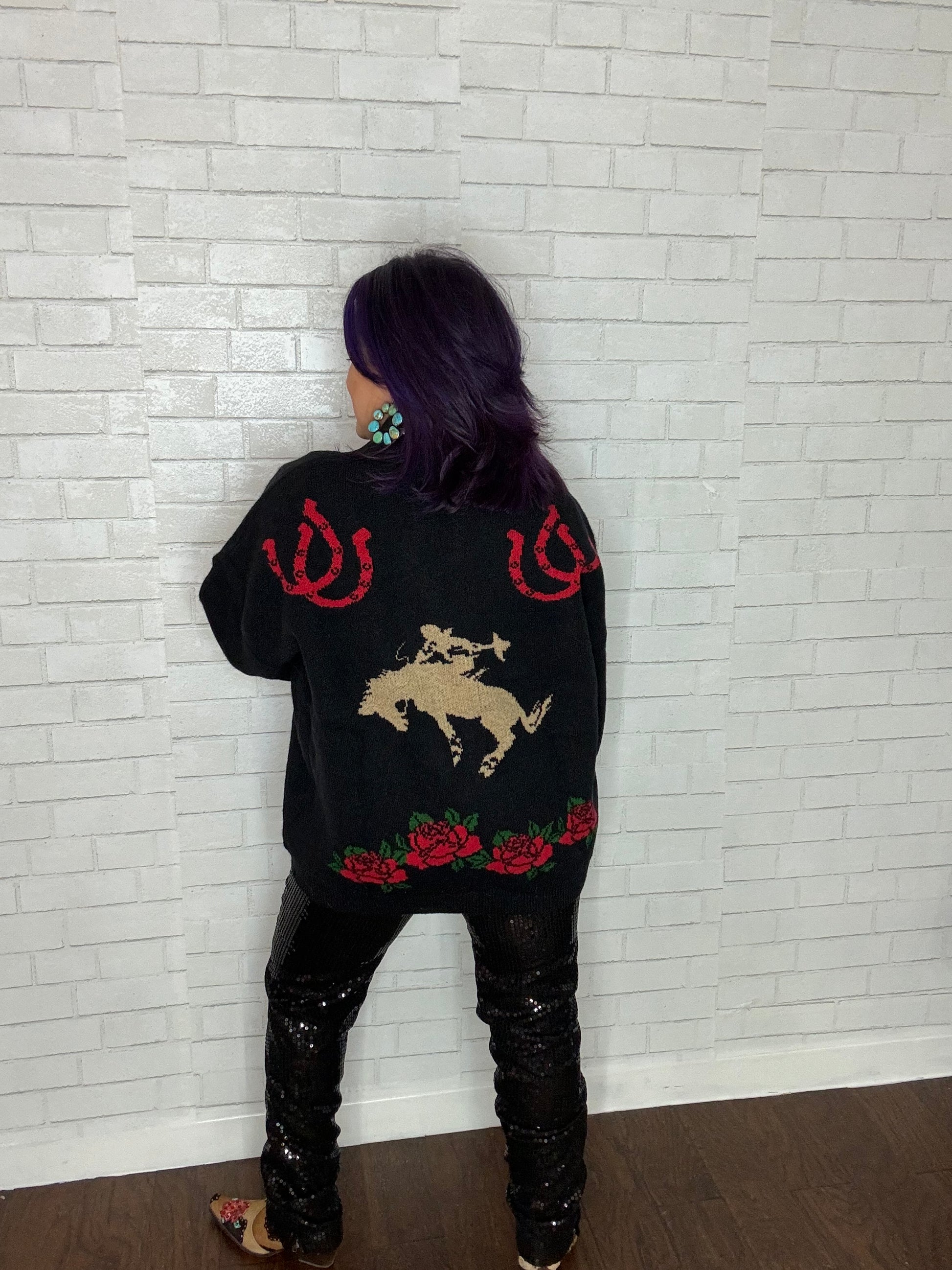 Wrap yourself in this loose-fitting cardigan, featuring bold roses and rodeo motifs—it's the ultimate way to show off your Western roots. Perfect for chilly evenings by the fire, it's like wearing your favorite blanket, but with way more style points.