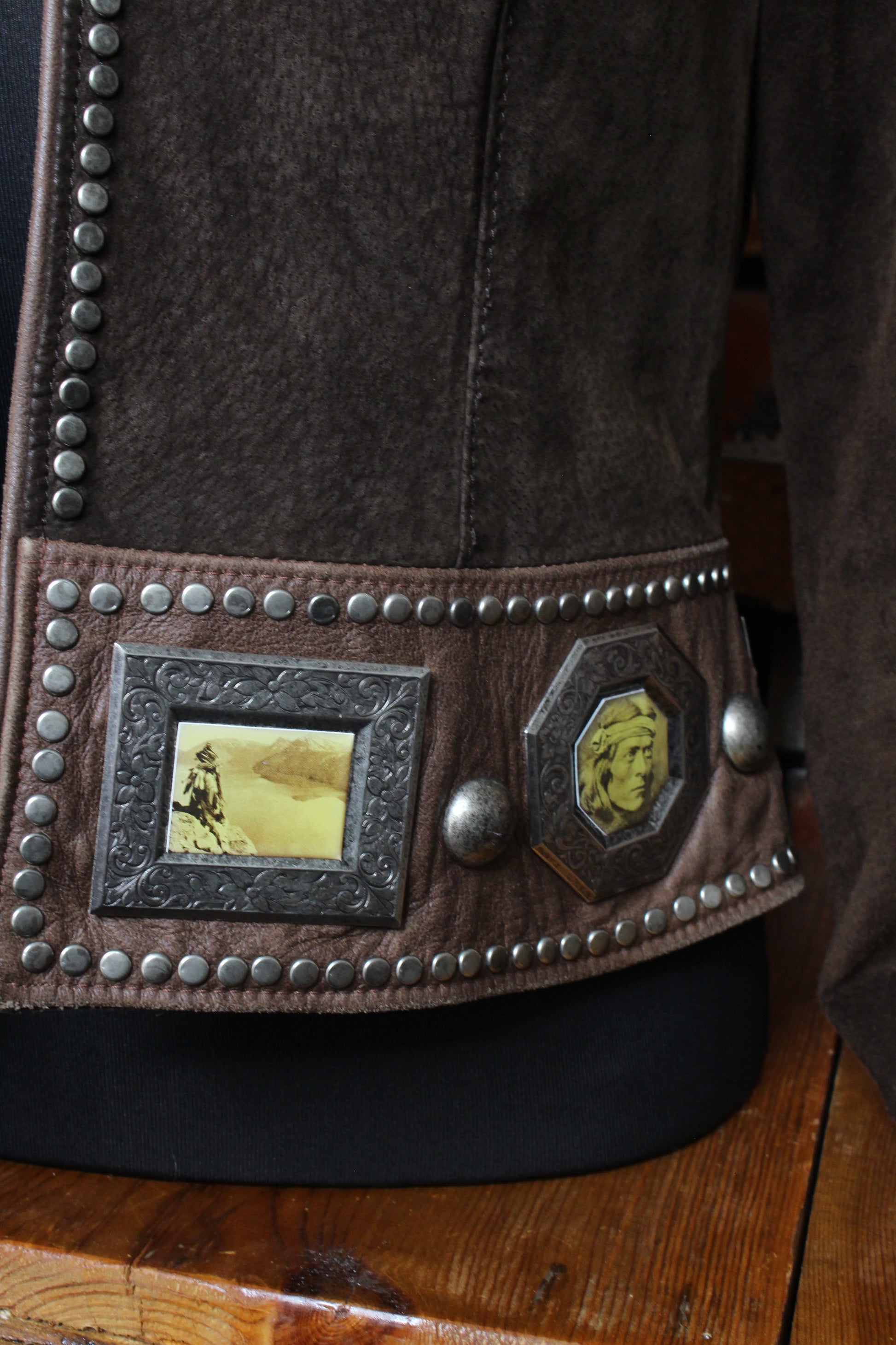This unique vintage jacket has Native pictures inside the frames that go around the bottom.