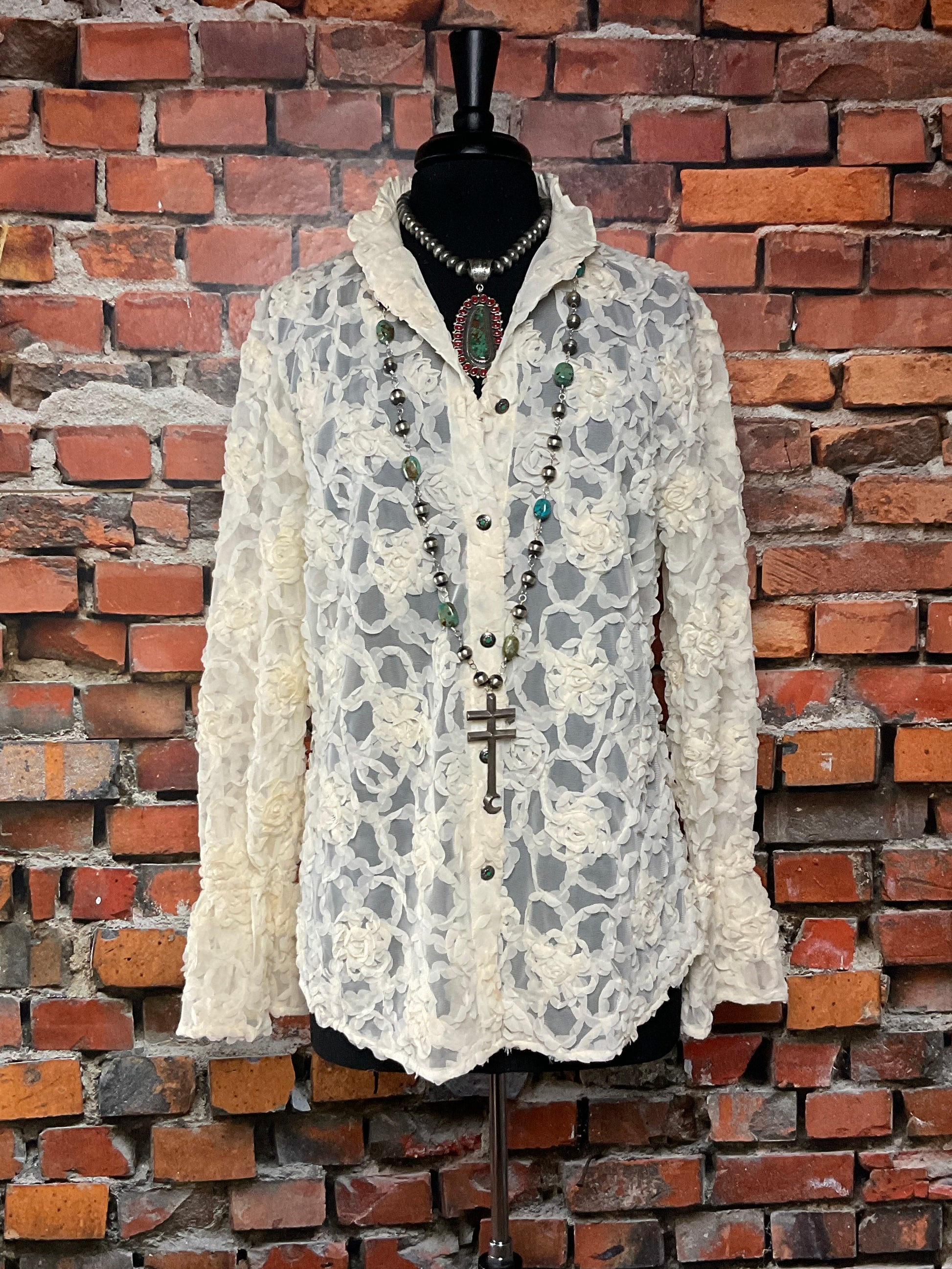 Rose Lace Blouse with Ruffled Collar and Sleeves