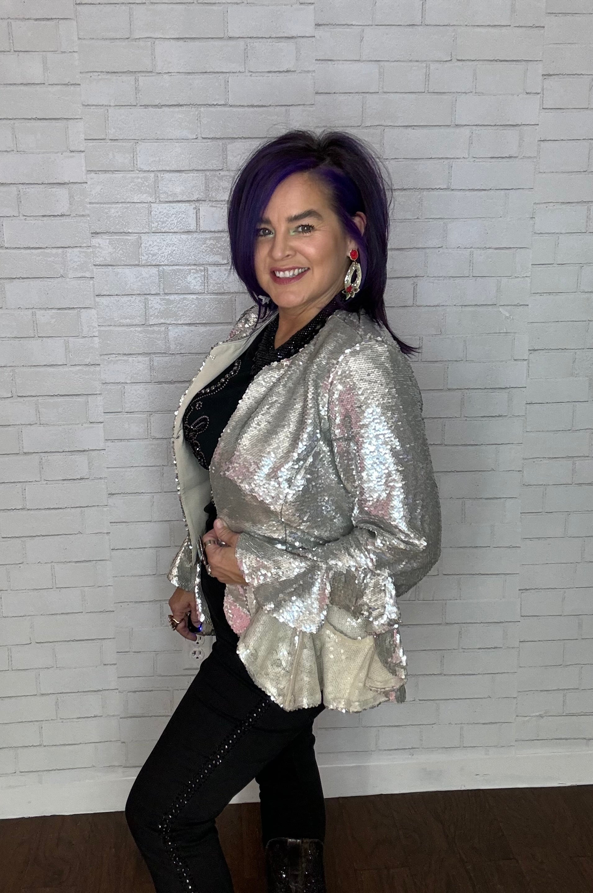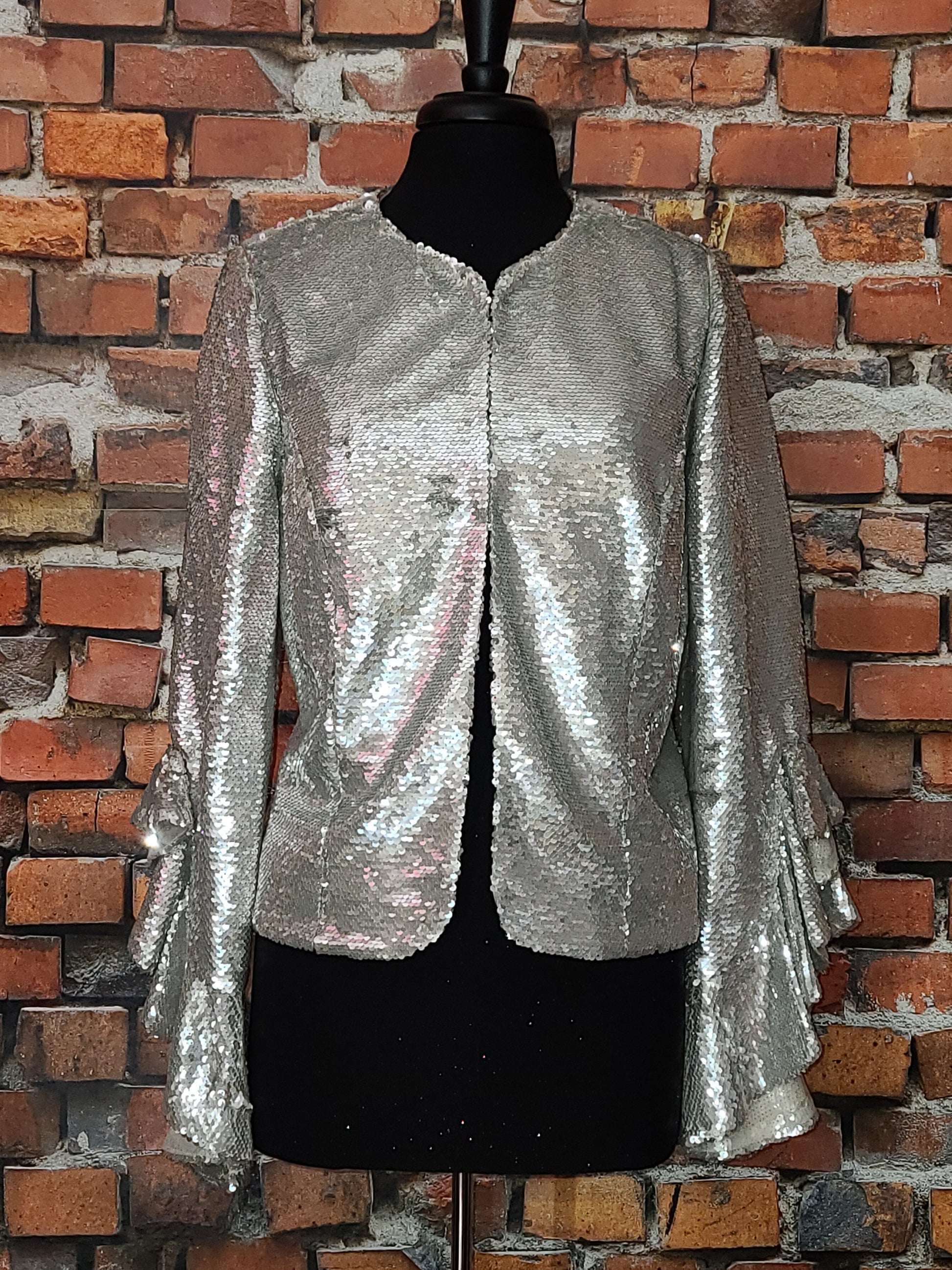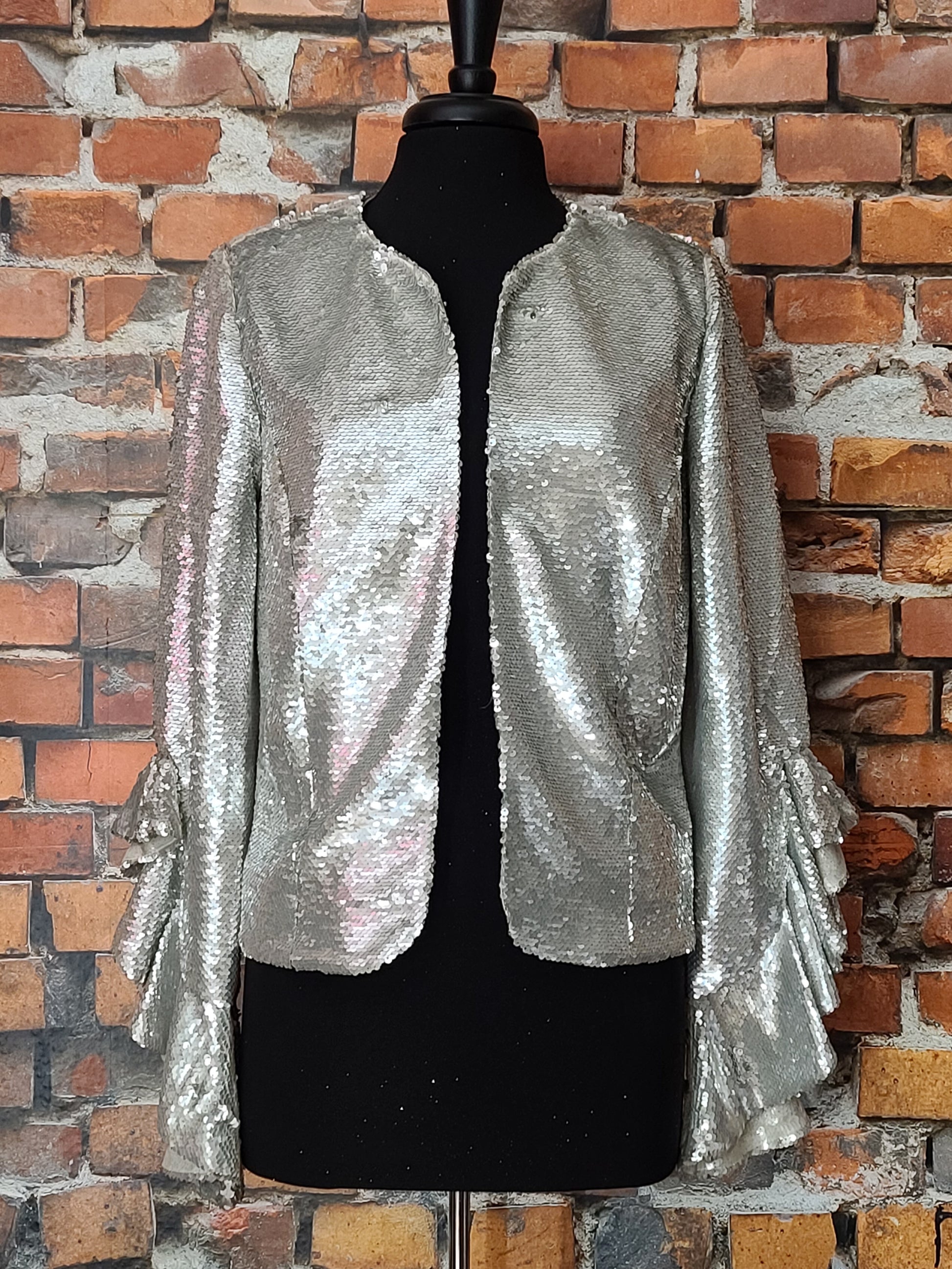 Ruffle embellished jacket featuring a round neck, long sleeves, ruffled sleeves, sequin embroidery, a slim fit. This jacket retails for $285