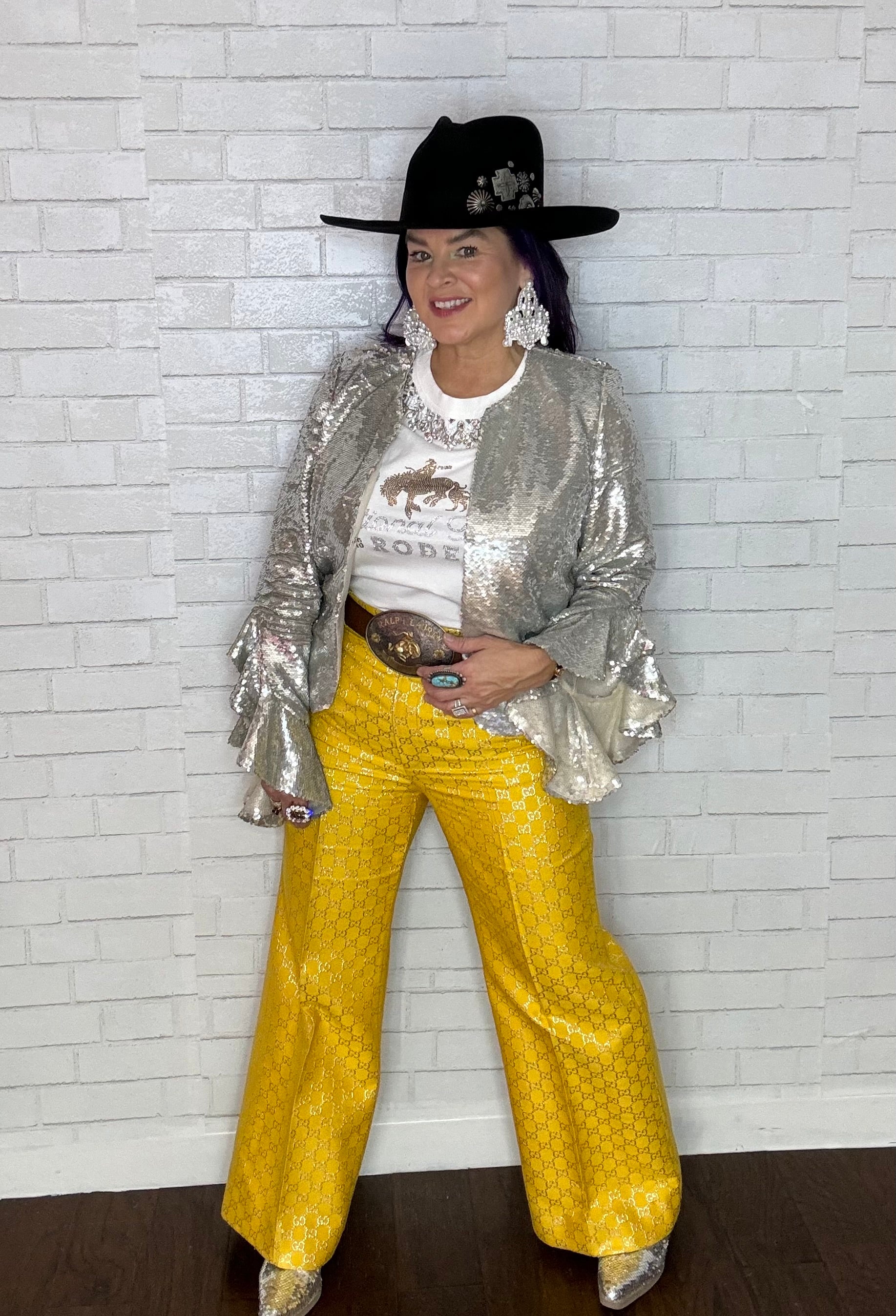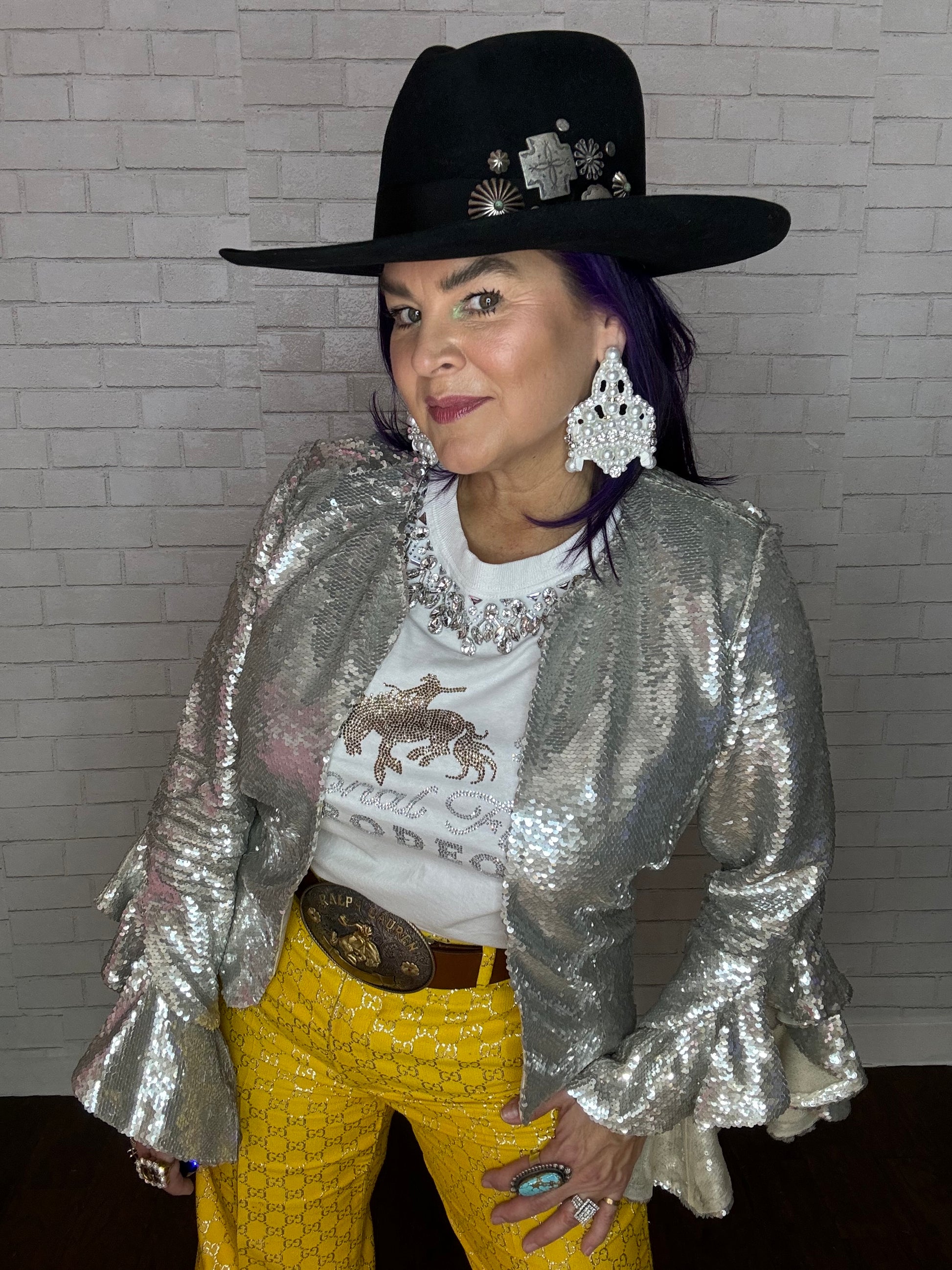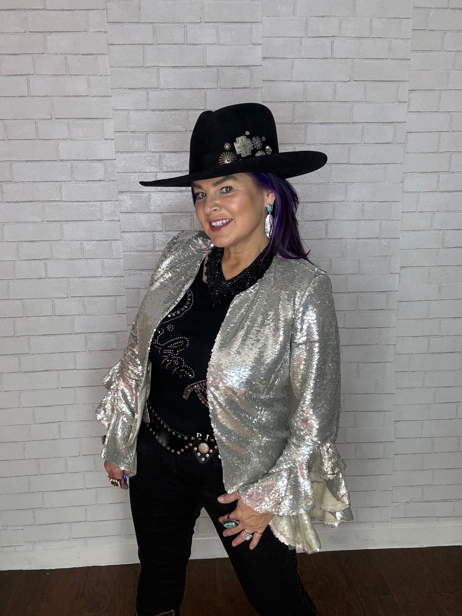 Ruffle embellished jacket featuring a round neck, long sleeves, ruffled sleeves, sequin embroidery, a slim fit. This jacket retails for $285
