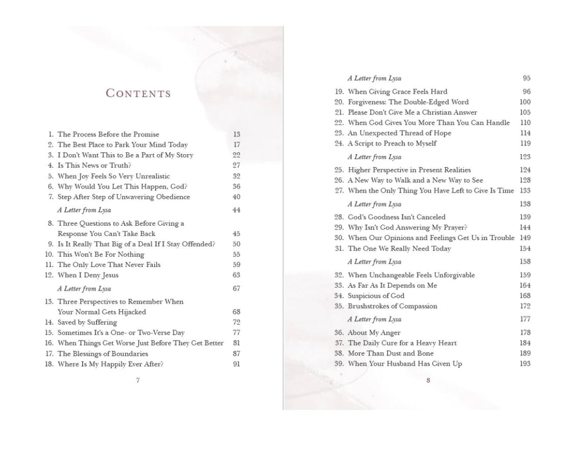 Lysa, president of Proverbs 31 Ministries, assures us that the aching pain we feel is proof there's a beautiful remaking already in process if we don't give up. Through these 50 devotions, Scriptures, prayer prompts, and personal notes from Lysa, you will: