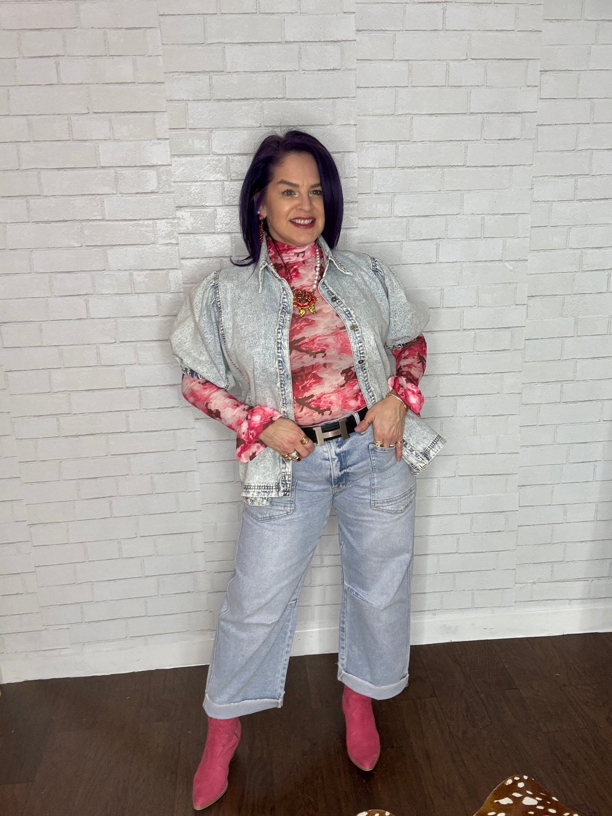 Comfort stretch denim, super high rise waist, pocket detail, raw hem, cropped length, barrel jeans.