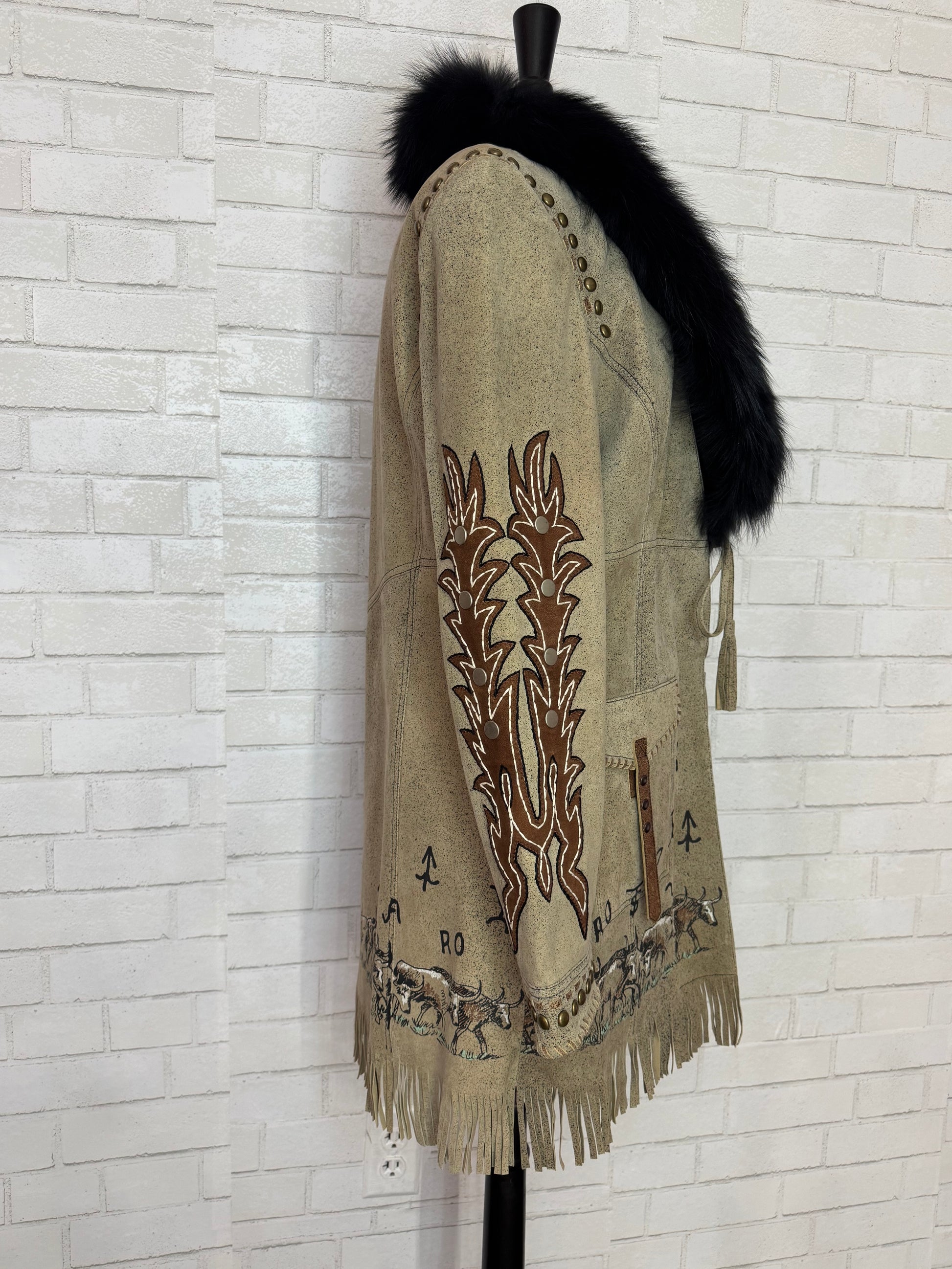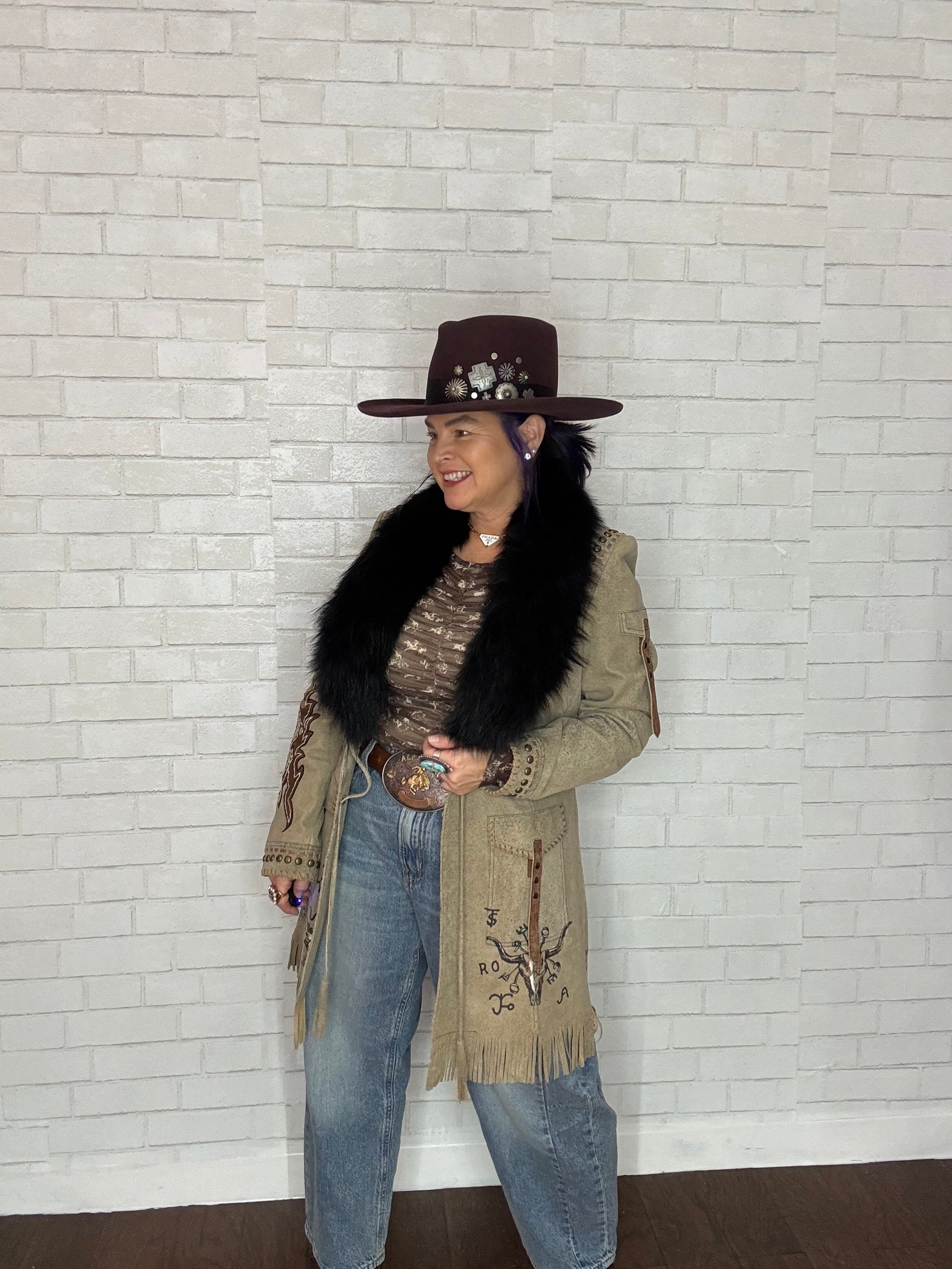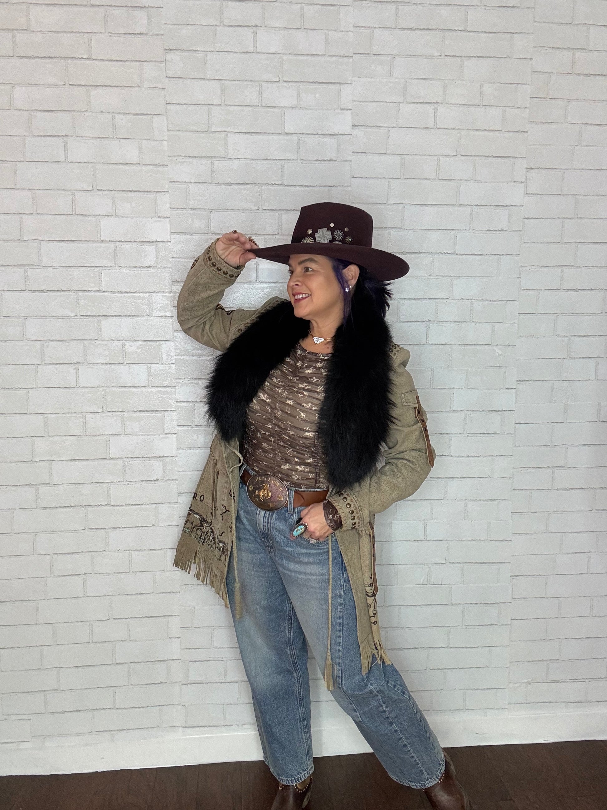 The ultimate cattle baroness staple, this iconic piece from DDR, The Cattleman Jacket! This stunner incorporates brands from some of the most notable cattle ranches, combined with authentic leather, fringe, and a show-stopping fur collar (fur collar is removable). “Ride for the brand!” BRAND NEW w/tag retailed for $1210