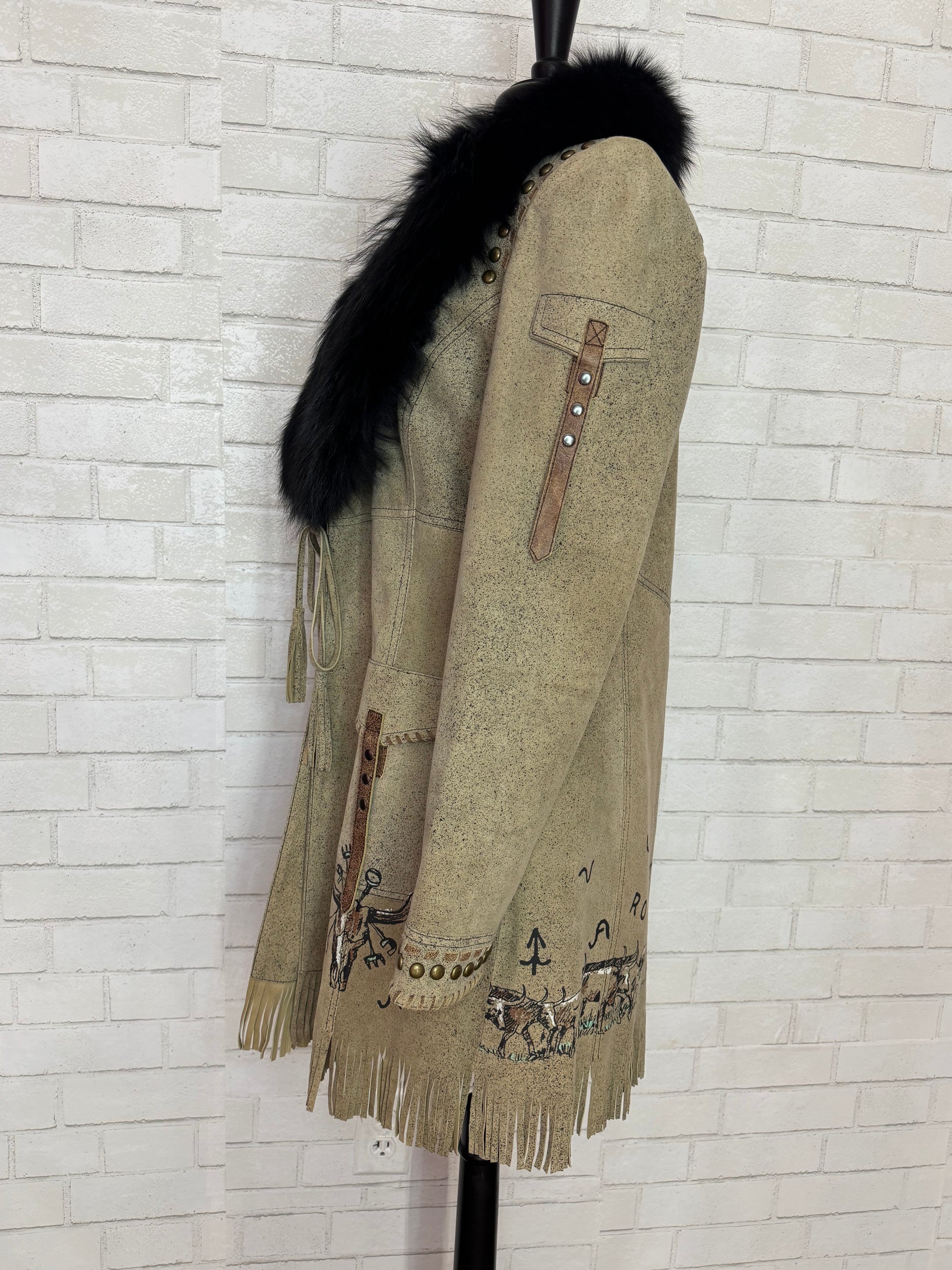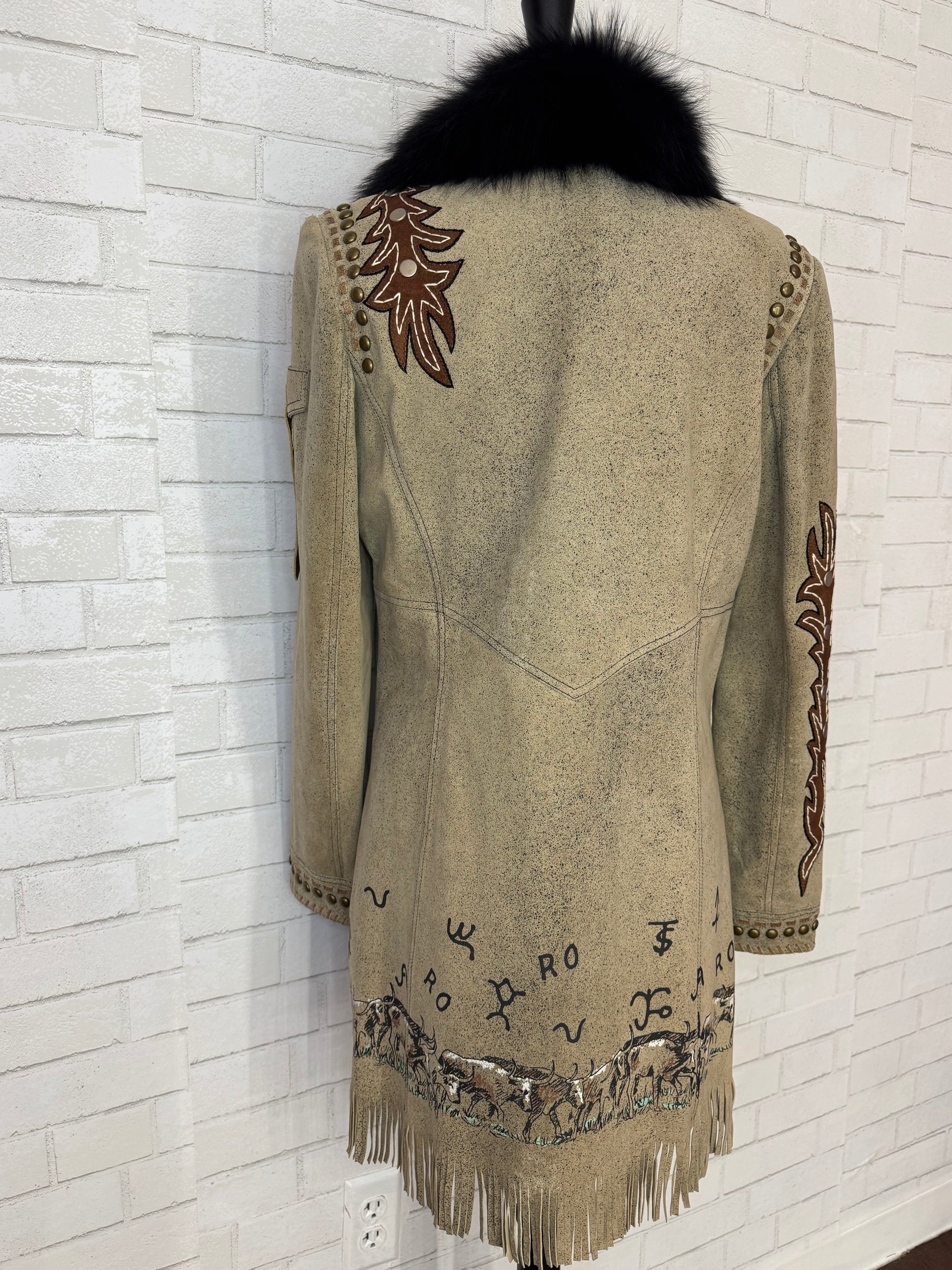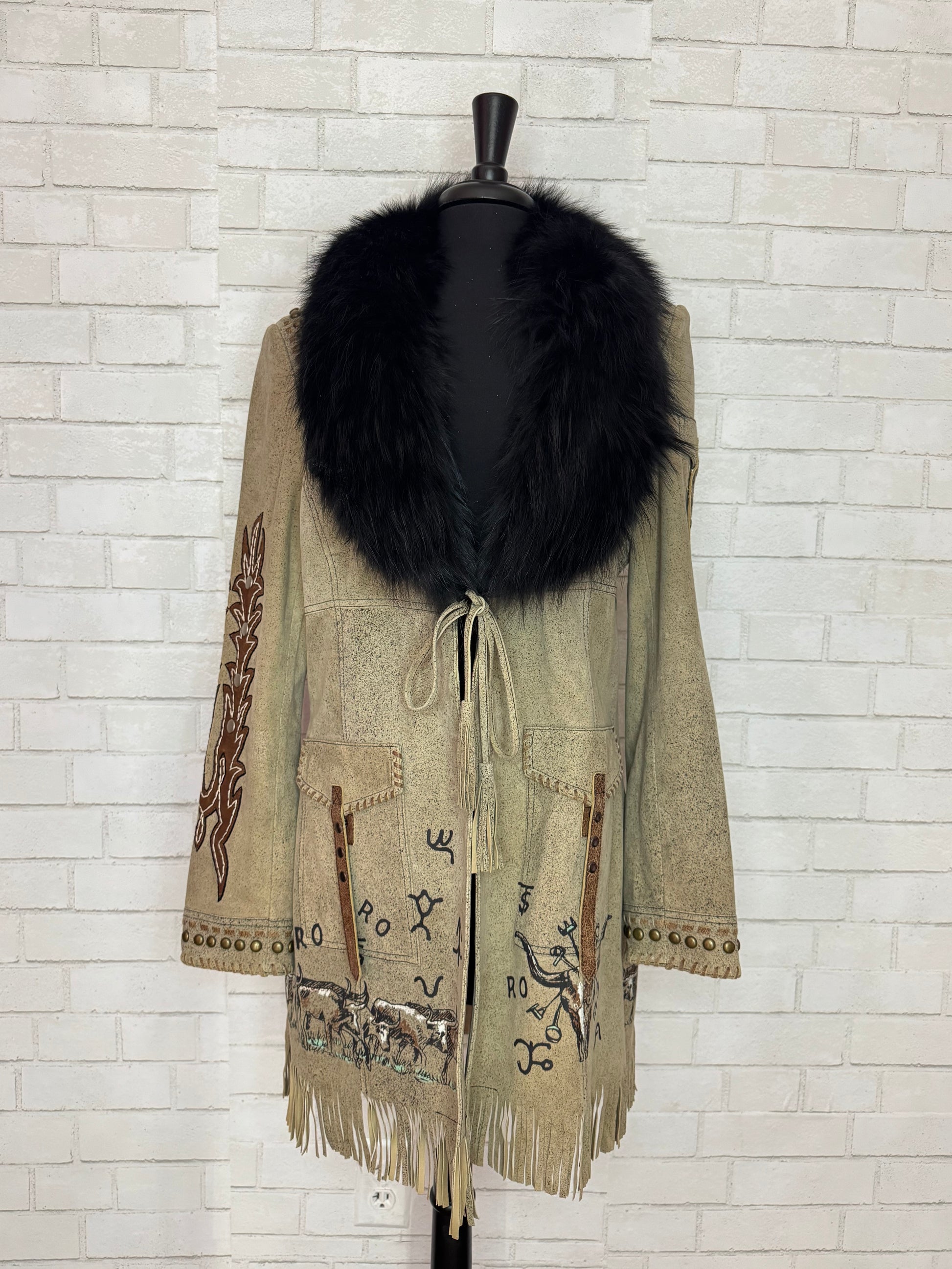 The ultimate cattle baroness staple, this iconic piece from DDR, The Cattleman Jacket! This stunner incorporates brands from some of the most notable cattle ranches, combined with authentic leather, fringe, and a show-stopping fur collar (fur collar is removable). “Ride for the brand!” BRAND NEW w/tag retailed for $1210