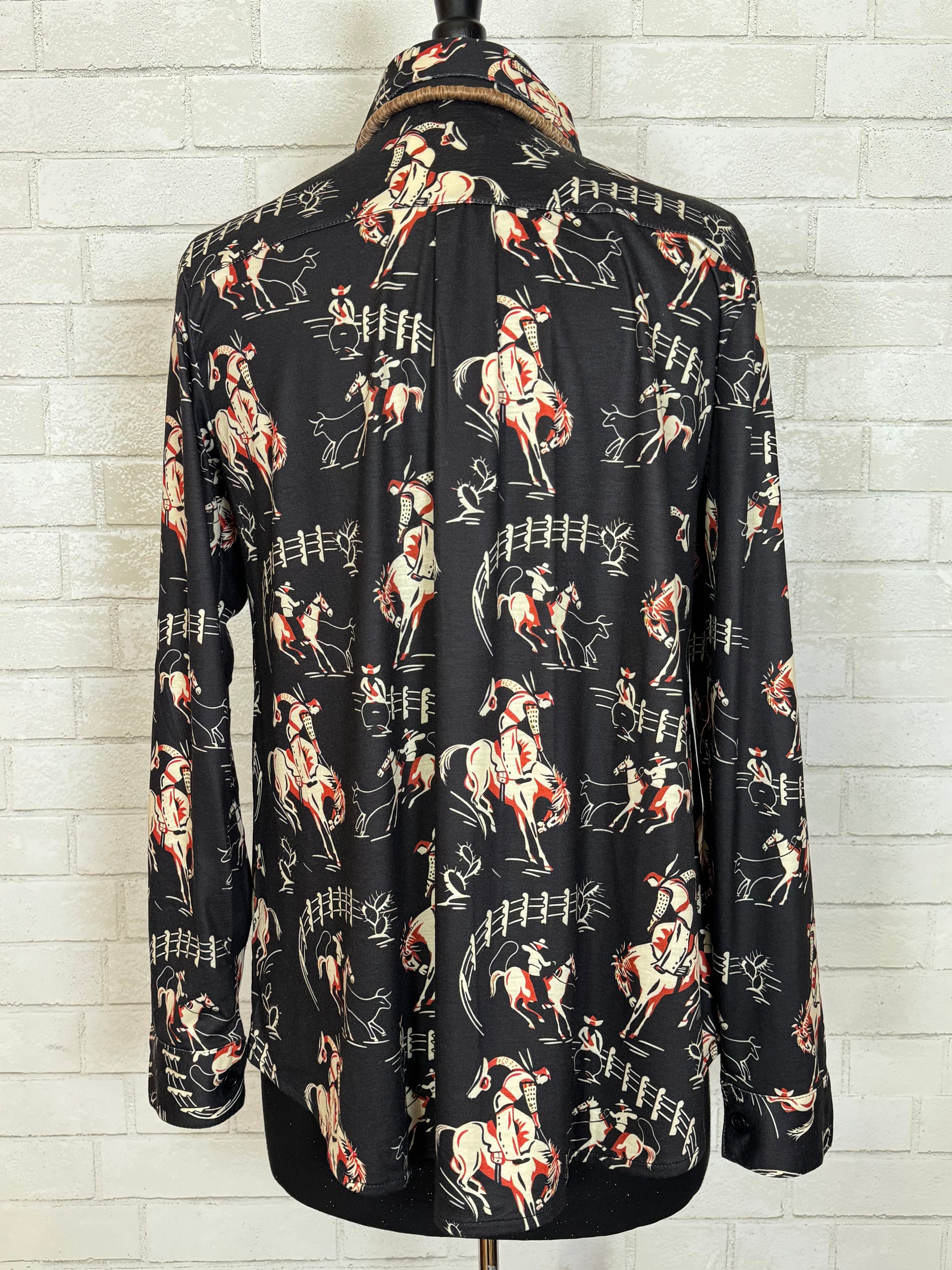 The fit of this shirt is amazing! Button up western horse printed long sleeve shirt. Stretchy, soft, breathable fabric.