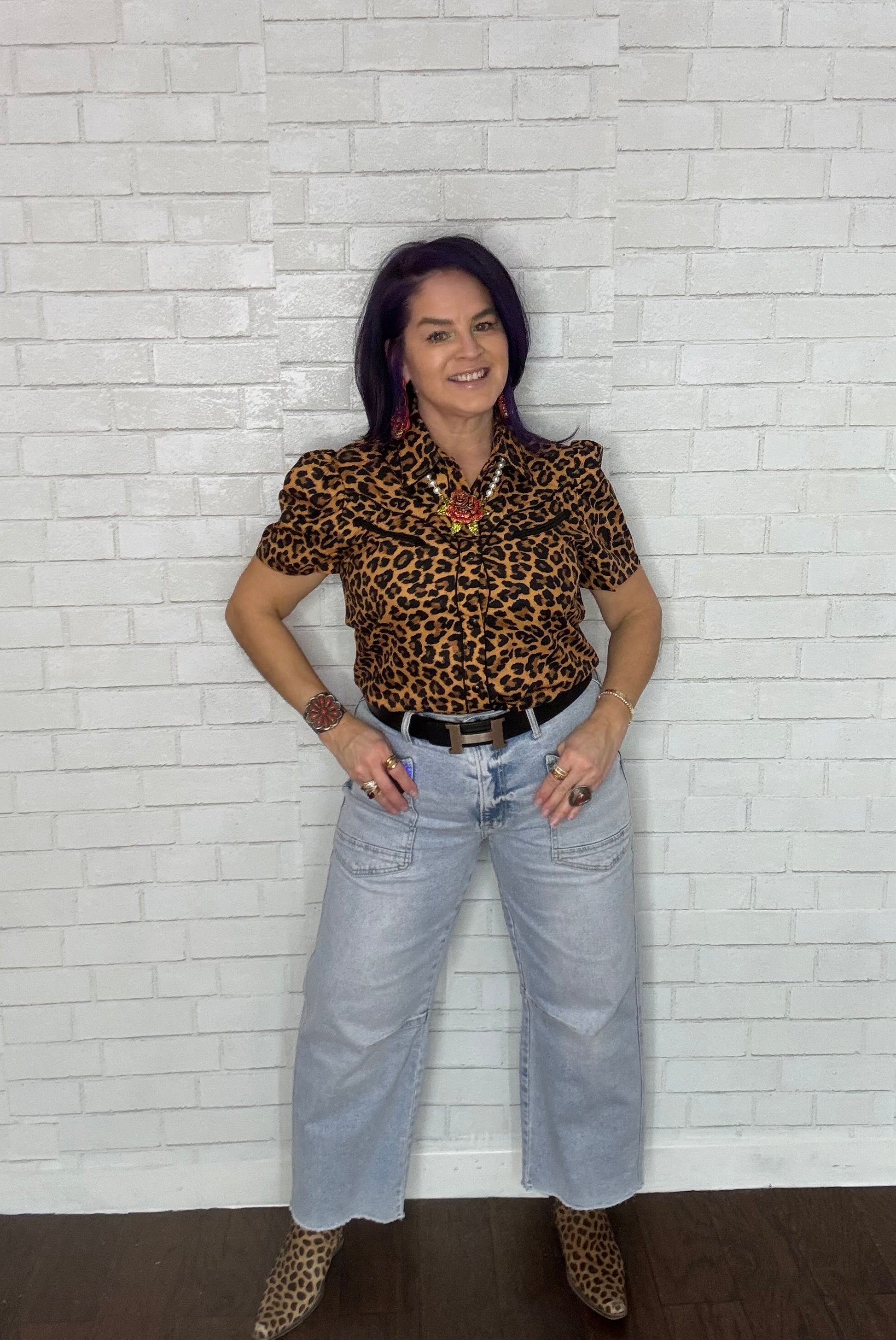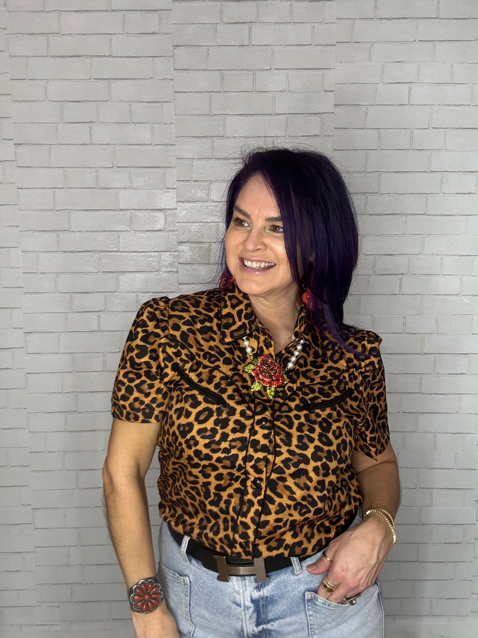 Western Short Sleeve Blouse with Pearl Snap Buttons Leopard Print